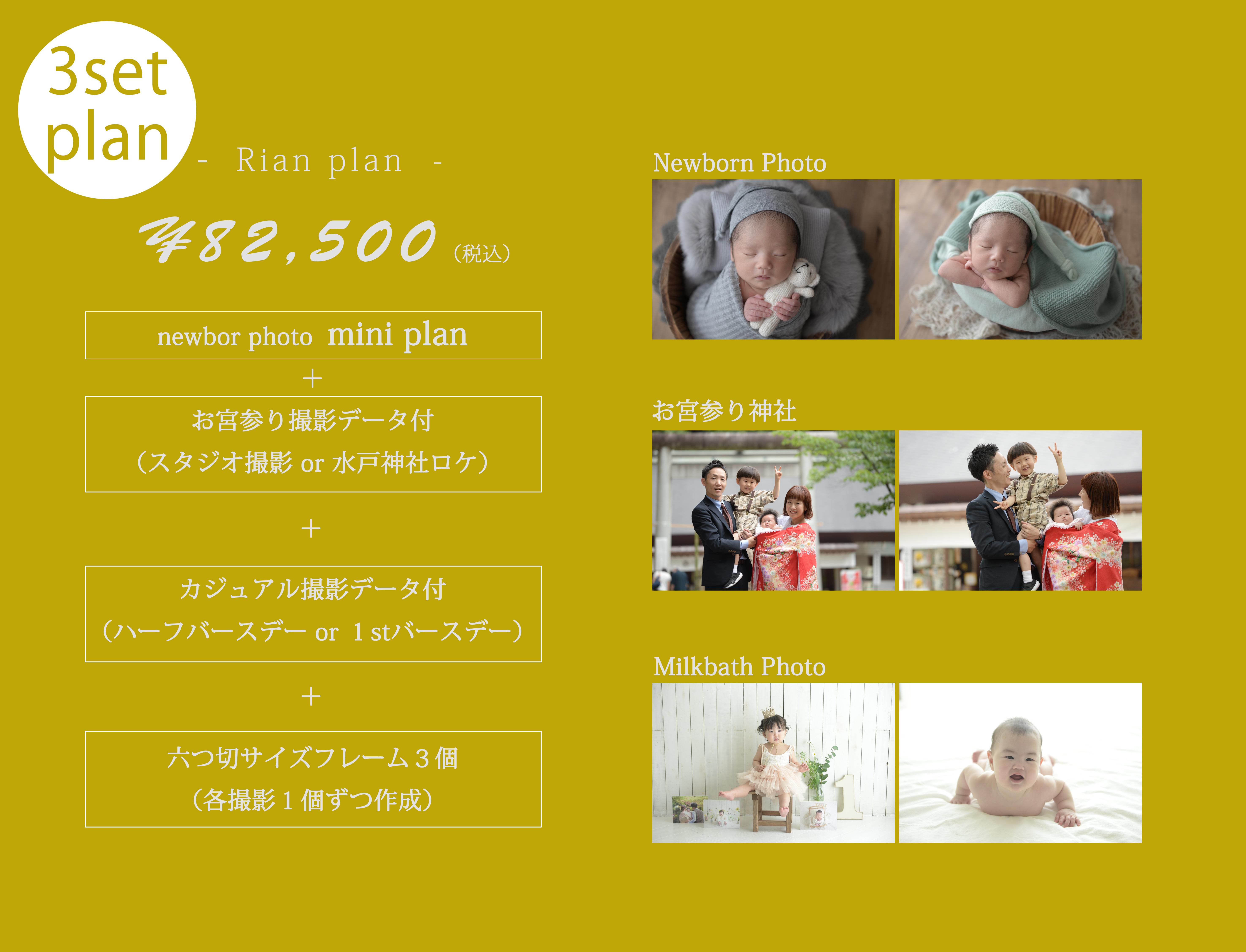 ニューボーンフォト、お宮参り撮影、1歳バースデーの3回撮影がセット